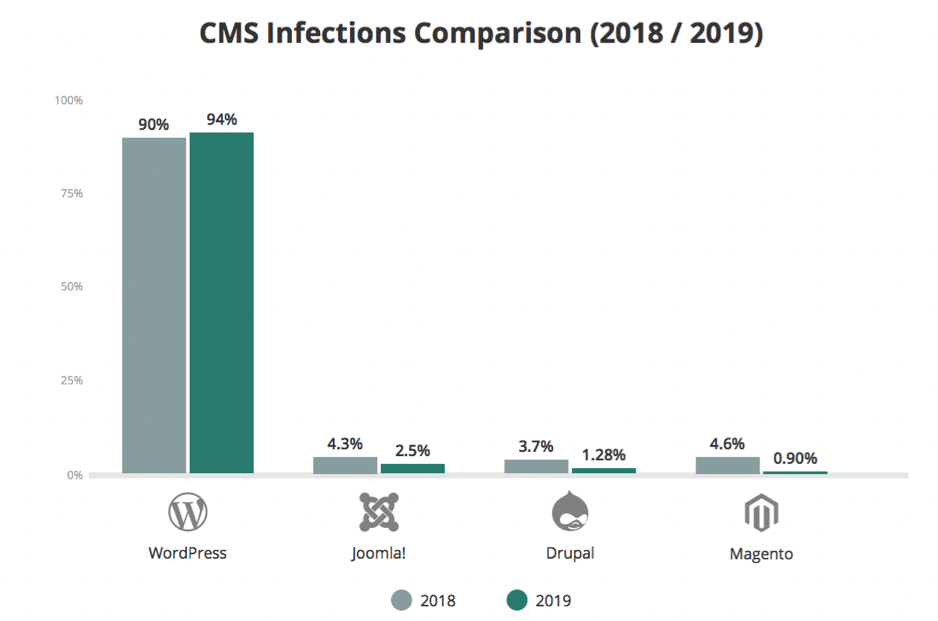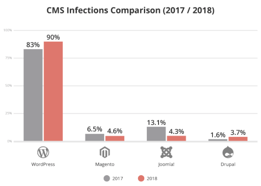 In 2018, 90% of all hacked CMS (content management system) was WordPress. Two years (2017- 2018) comparison showed a 7% increment in WordPress attacks: